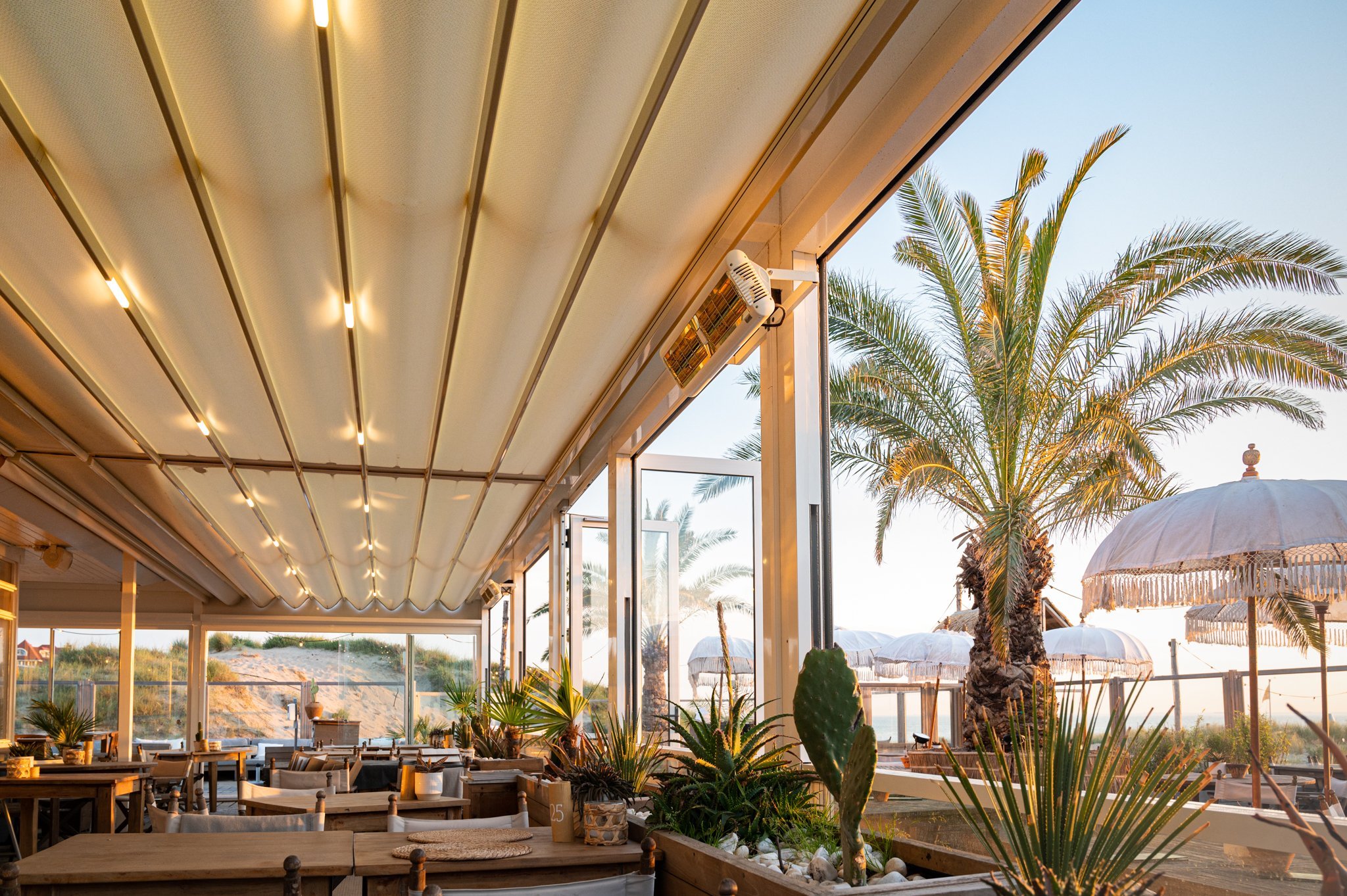 Akdeniz havasına sahip, davetkâr beach club. Misafirler, yıl boyunca Noordwijk kumullarındaki özel konumun, panoramik deniz manzarasının ve eşsiz mutfağın keyfini çıkarıyor. Teras pergolası, kişiselleştirilmiş konfor için sonsuz olasılıklar sunuyor. Yağmur mu, hafif esinti mi? Işık mı, gölge mi? Güneş ve yıldızlar. Günün her saatinde ve her hava koşulunda keyifli.